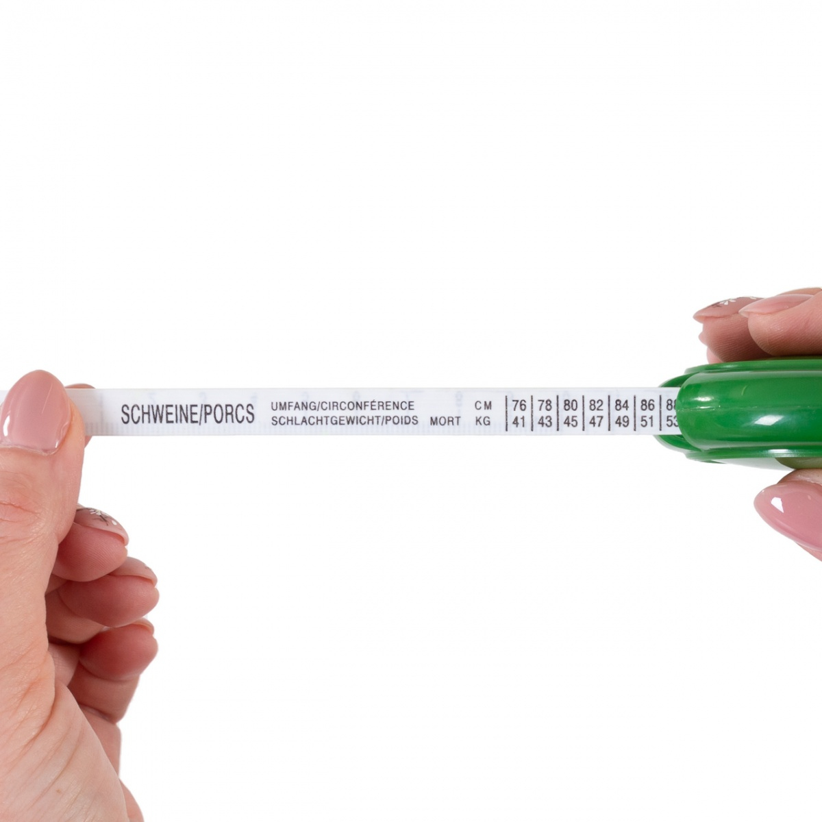 În cazul porcinelor: Măsurați animalul în cm în jurul toracelor, citiți valoarea circumferinței, întoarceți banda la tabelul SCHWEINE/PORCS și căutați valoarea potrivită.
