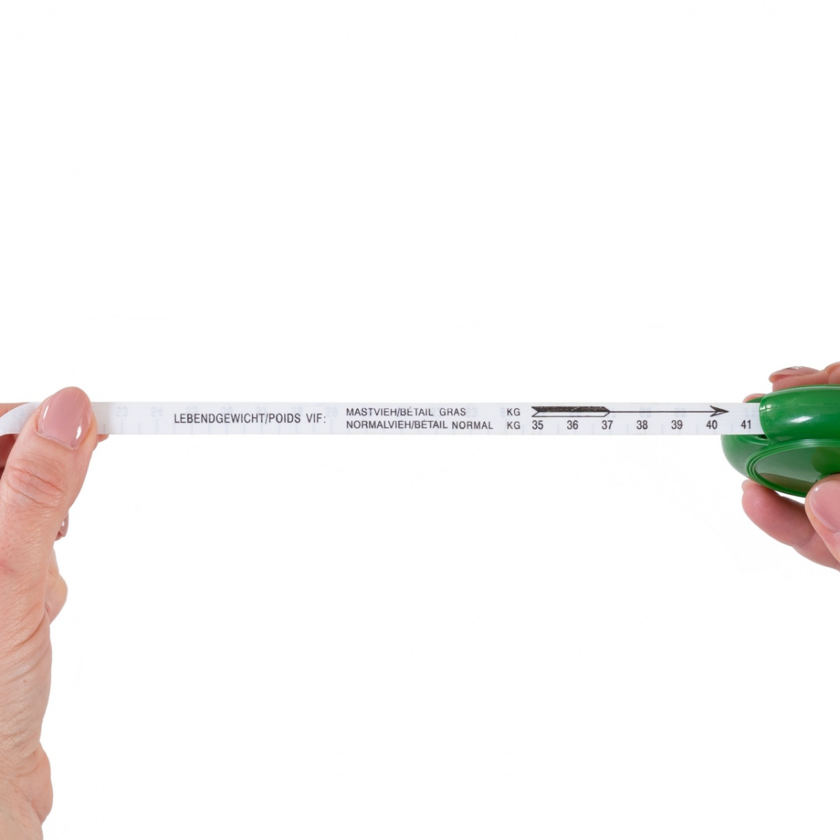 În cazul bovinelor: Măsurați animalul în cm în jurul toracelor, întoarceți banda pe partea opusă și citiți valoarea indicată ce corespunde cu valoarea greutății animalului (LEBENDGEWICHT/POIDS VIF). Pentru animalele din rase de carne se ia în considerare valoarea mai mare (BETAIL GRAS), iar pentru animalele din rase mixte valoarea mai mica (BETAIL NORMALS).