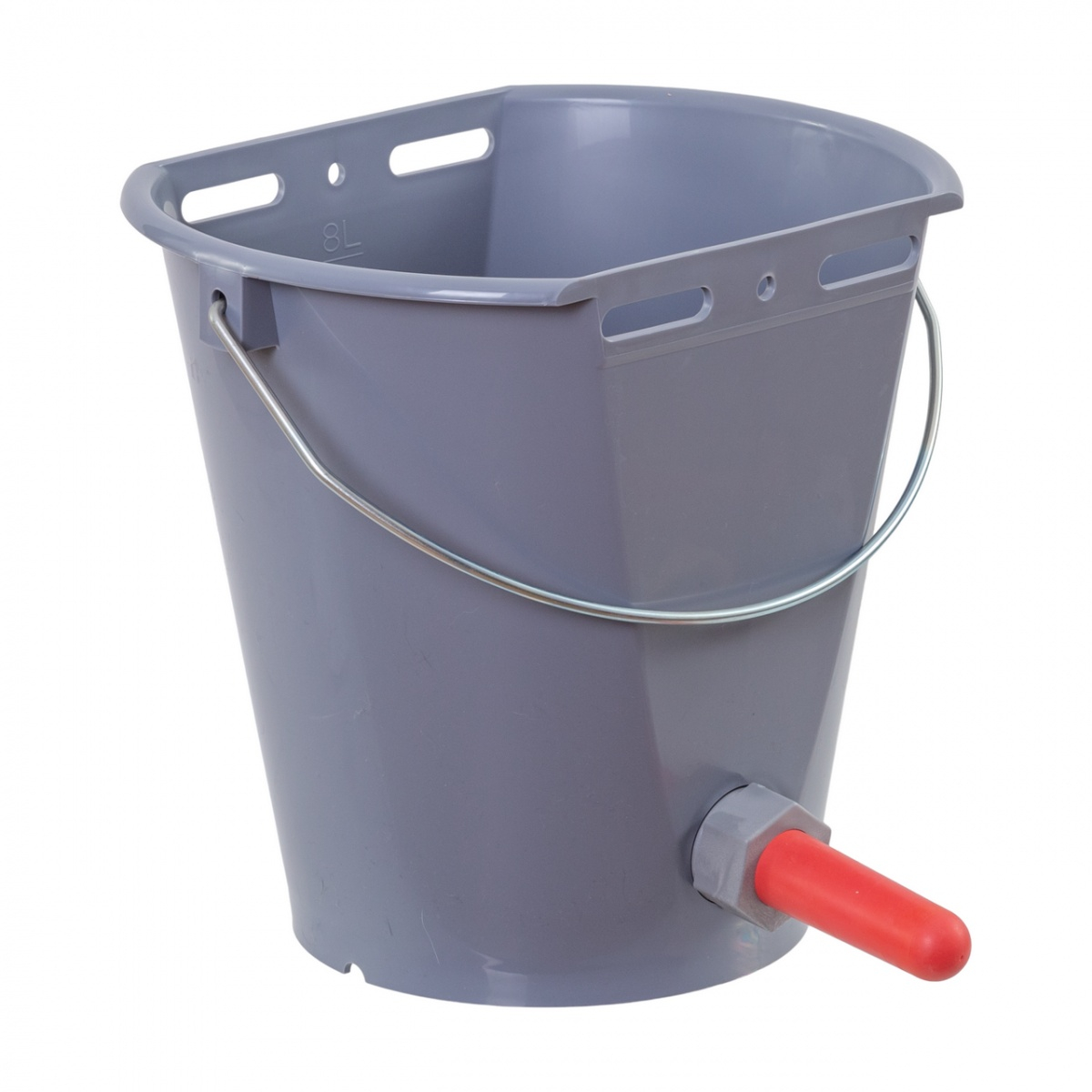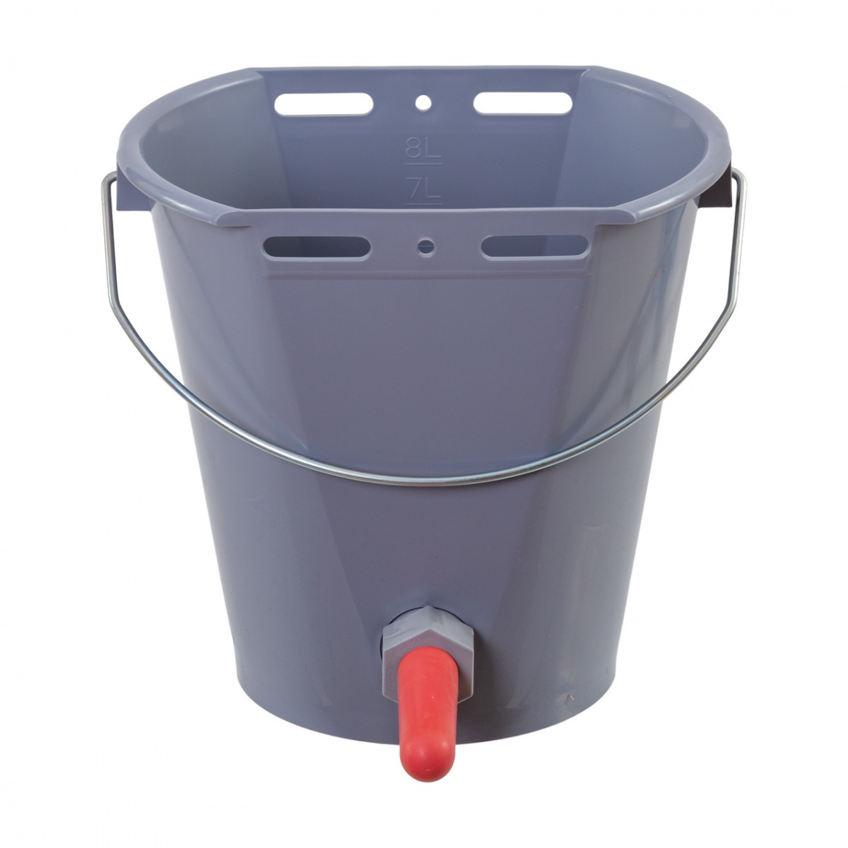 Găleata se poate agăța din față sau din spate prin orificiile de suspensie. Fundul înclinat asigură golirea totală a laptelui/apei. Gradația în relief ajută la dozarea exactă a cantității de umplere.