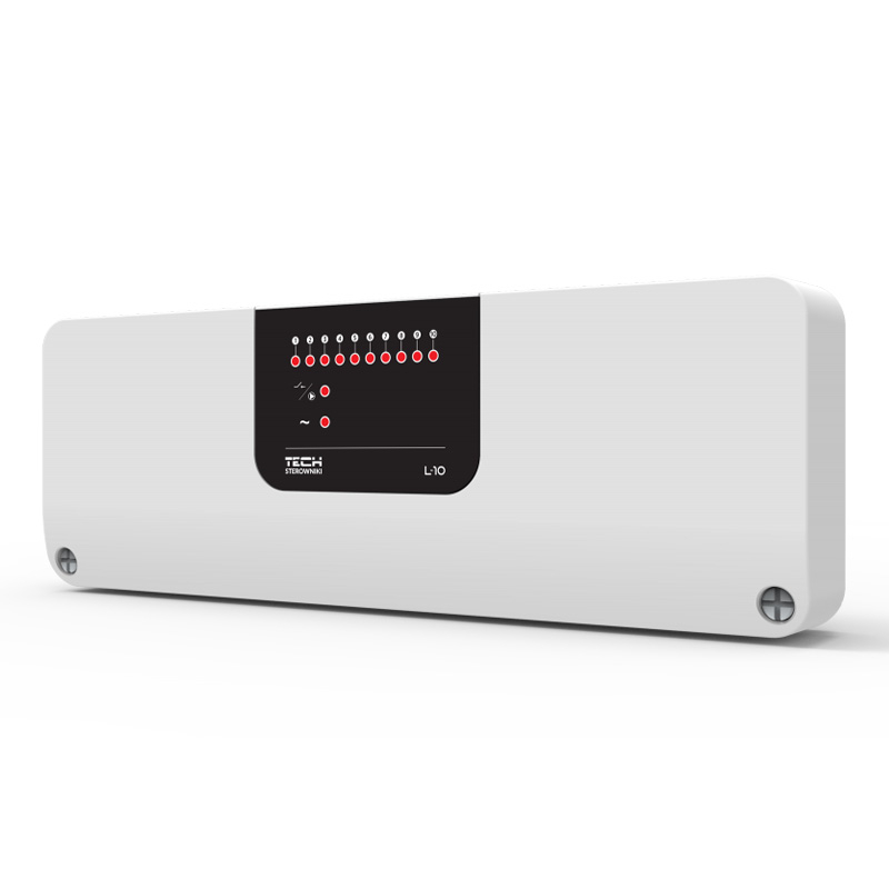 Controlerul / regleta pentru distribuitor EU L10 cablat – 10 zone este un sistem de control cu fir pentru încălzirea prin pardoseală conceput pentru a controla până la 50 de actuatori prin intermediul a 18 ieșiri.