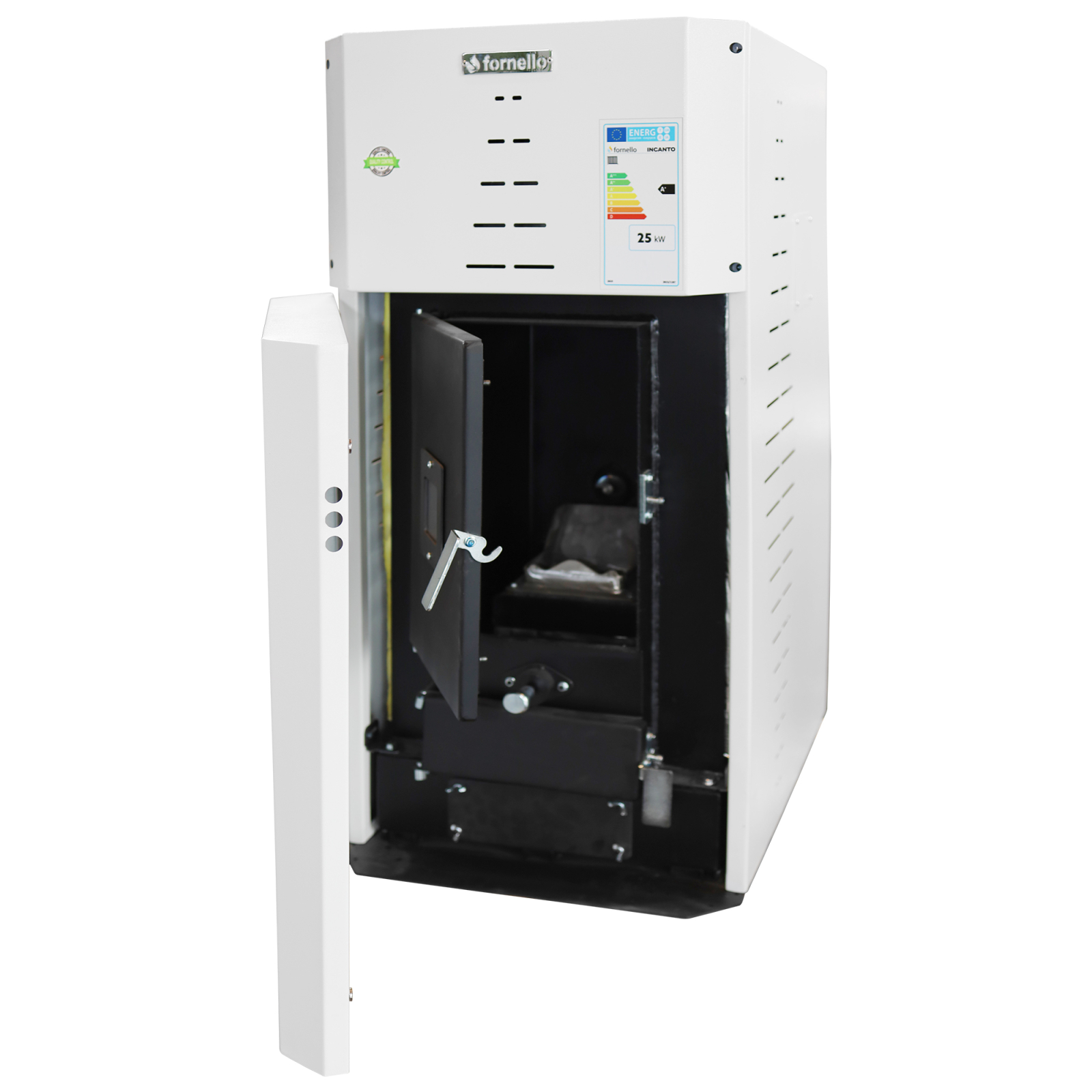 Centrala pe peleti Fornello INCANTO COMPACT 35 kW, pompa electronica, vas expansiune, arzator inox, grup de siguranta, sistem de curatare MECANICA a creuzetului si drumurilor de fum, culoare alb