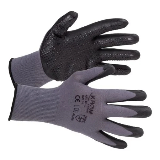 Mănuși pe bază de nylon + spandex gri cu aplicații pe palmă de picouri din nitril; mulare lejeră pe mână; palmă imersată în spumă microfină de nitril gri cu rezistență sporită la produse petroliere; manșetă elastică, dosul palmei aerisit.