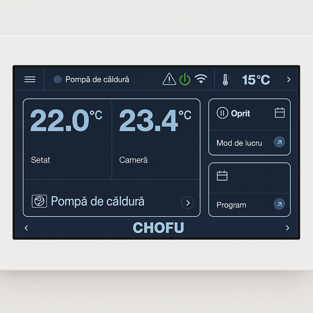 Modulul Wi-Fi CMR-4100M este un panou de control inteligent, compatibil cu pompele de căldură CHOFU, ce permite monitorizarea și controlul complet al instalației atât local, cât și de la distanță, prin intermediul internetului.