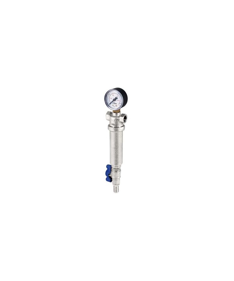 Filtrul cu curatare prin purjare RBM este format din urmatoarele componente: capac port-filtru cu robinet de purjare cu racord port-furtun, cartus filtrant din otel AISI 304 si manometru (scala 0 - 16 bar) pentru controlul presiunii de intrare.