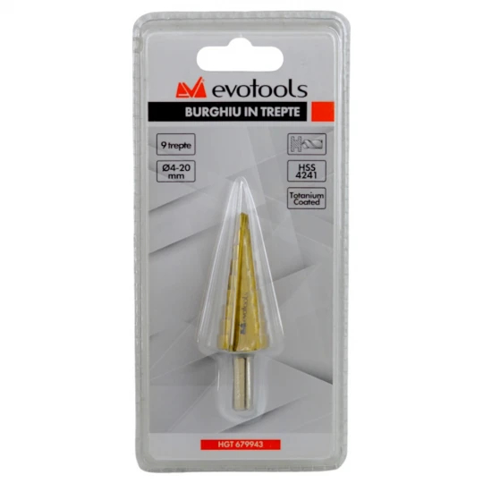 Designul in trepte permite largirea treptata a orificiului, reducand vibratiile si riscul de agatare in material.